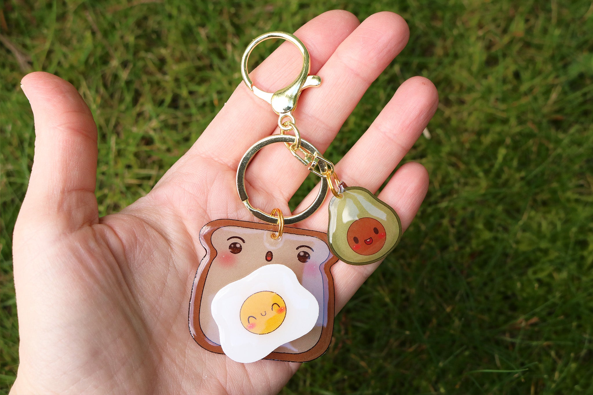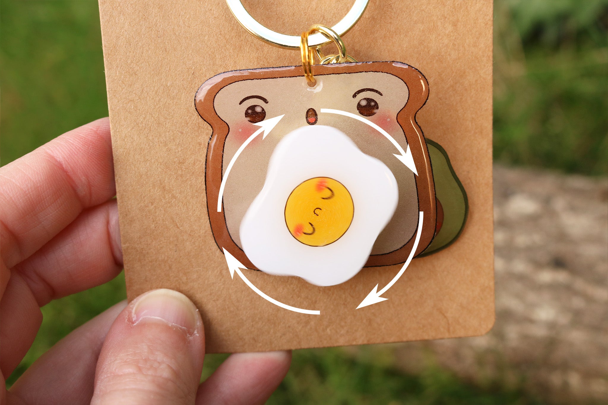 Está compuesto por una tostada sorprendida de ver cómo el huevo frito gira en su barriguita y por un alegre aguacate. El huevo funciona como un spinner, girando a toda velocidad.