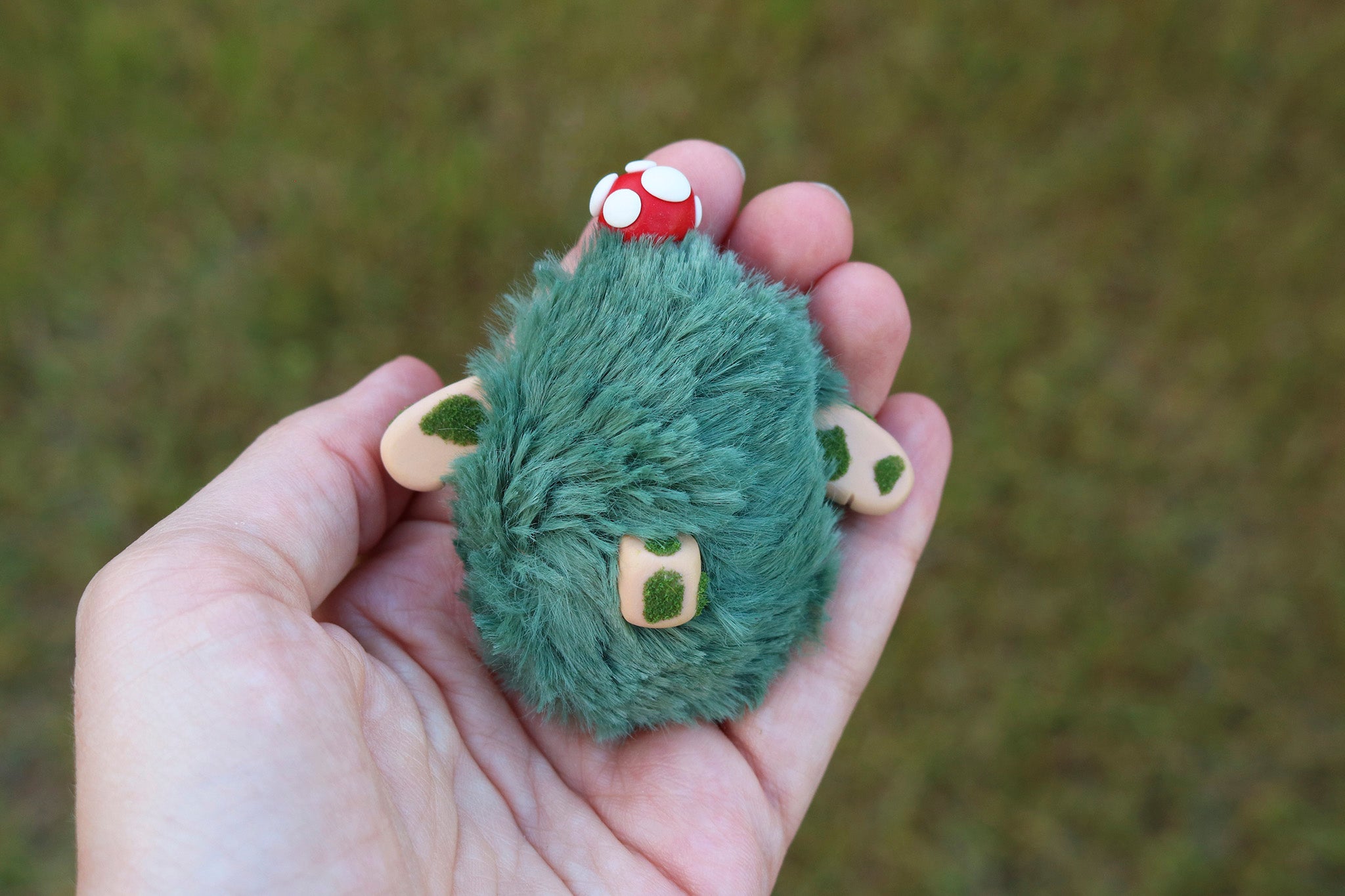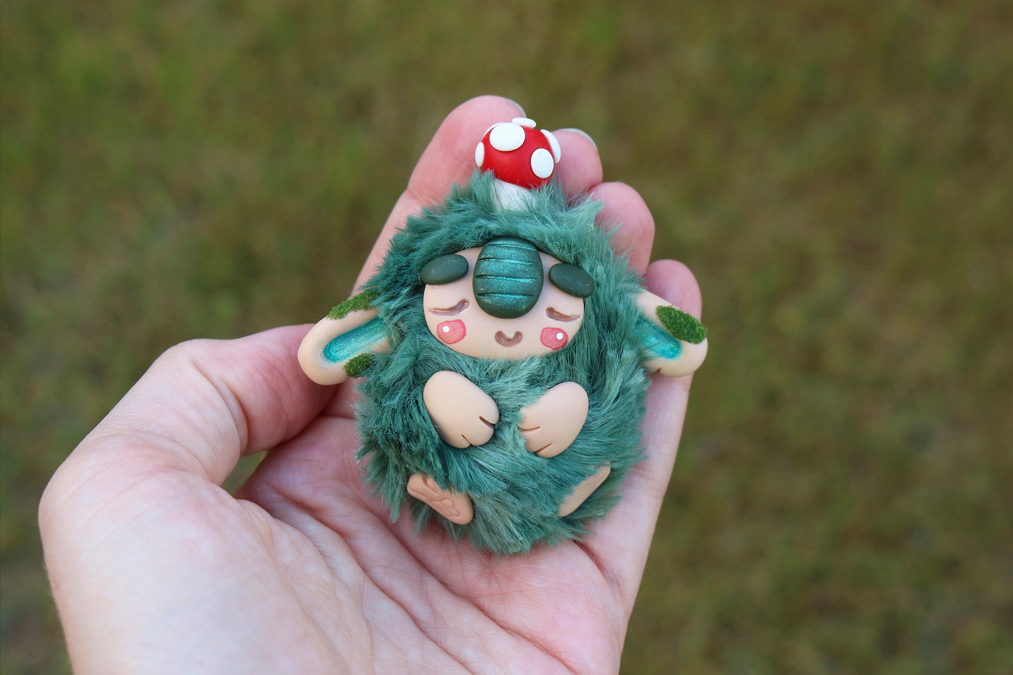 La cabeza, manos, pies, cola, y seta están hechos de arcilla polimérica pintada y decorada a mano. Su pelaje está hecho de tela de pelo falso, ningún animal ha sido dañado para hacer este muñeco. Es un pelaje muy suave, denso y precioso..