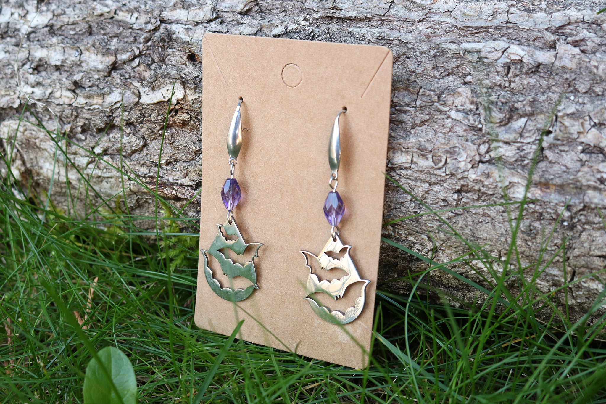Pendientes con forma de gota con tres murciélagos y un cristal morado. Hechos con materiales de la mejor calidad para garantizar una larga duración.