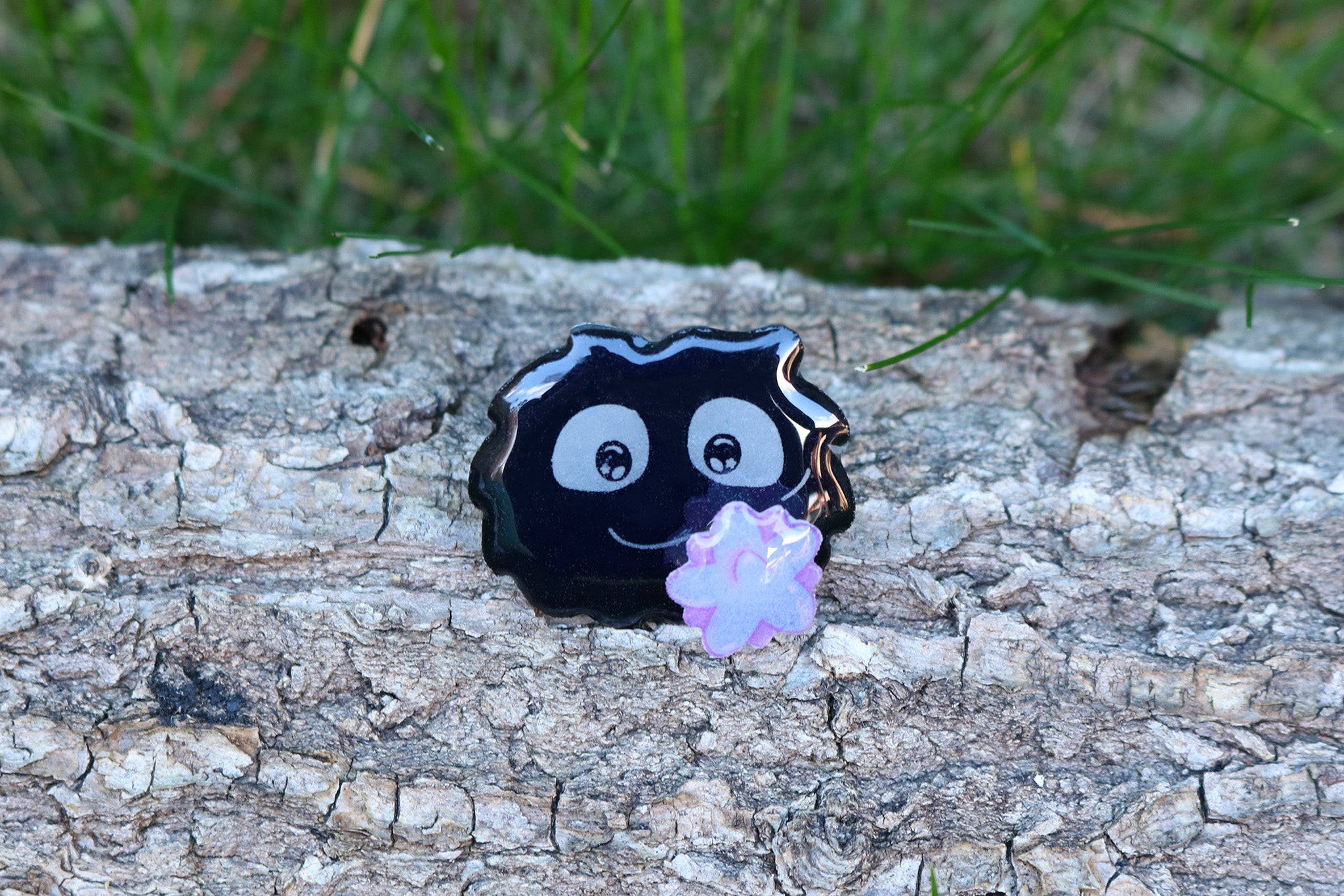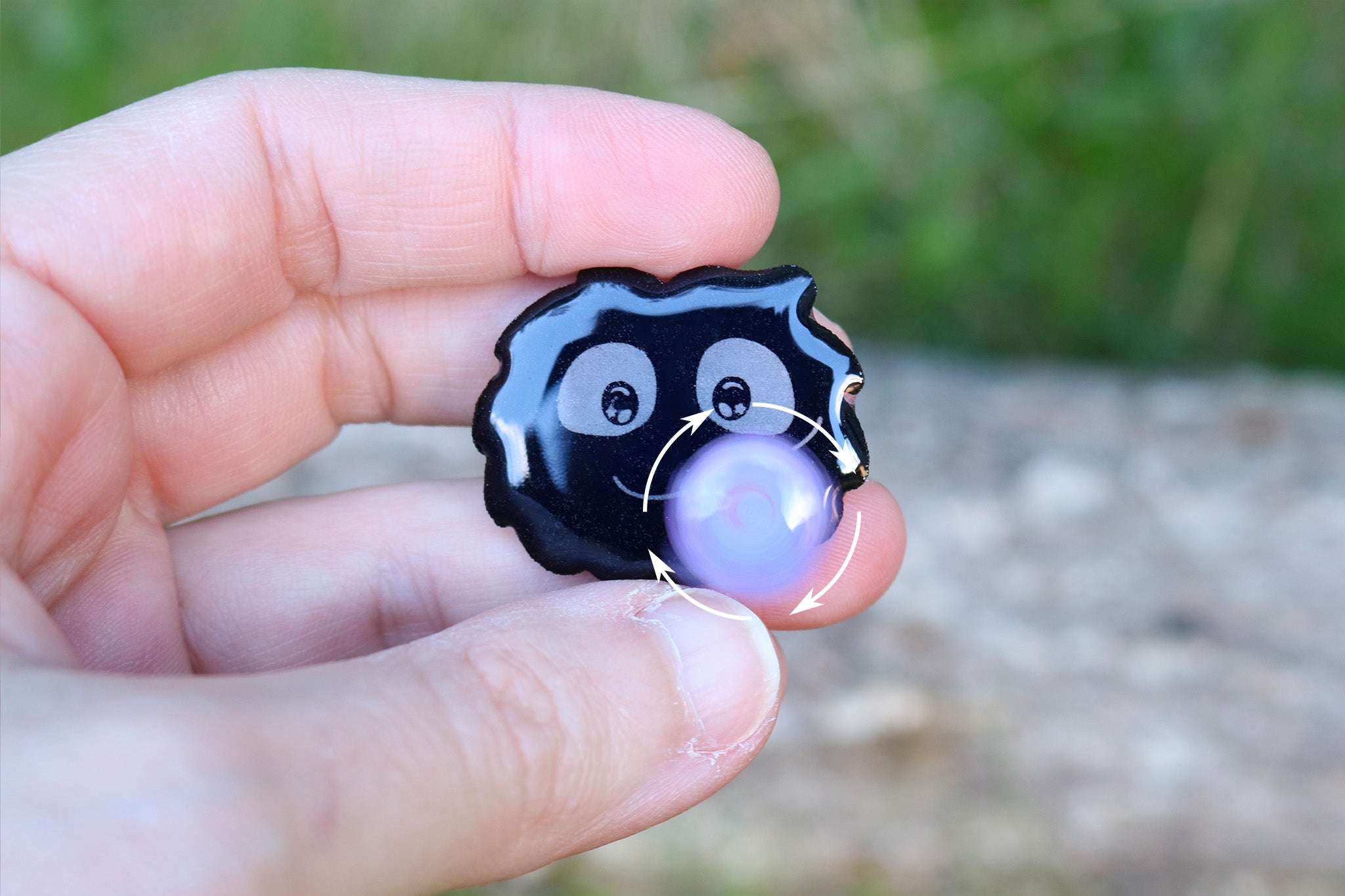 Un pin hecho en casa de un susuwatari de las películas ¨Mi vecino Totoro¨ y ¨El viaje de Chihiro¨. El caramelo (konpeito) gira como un spinner.