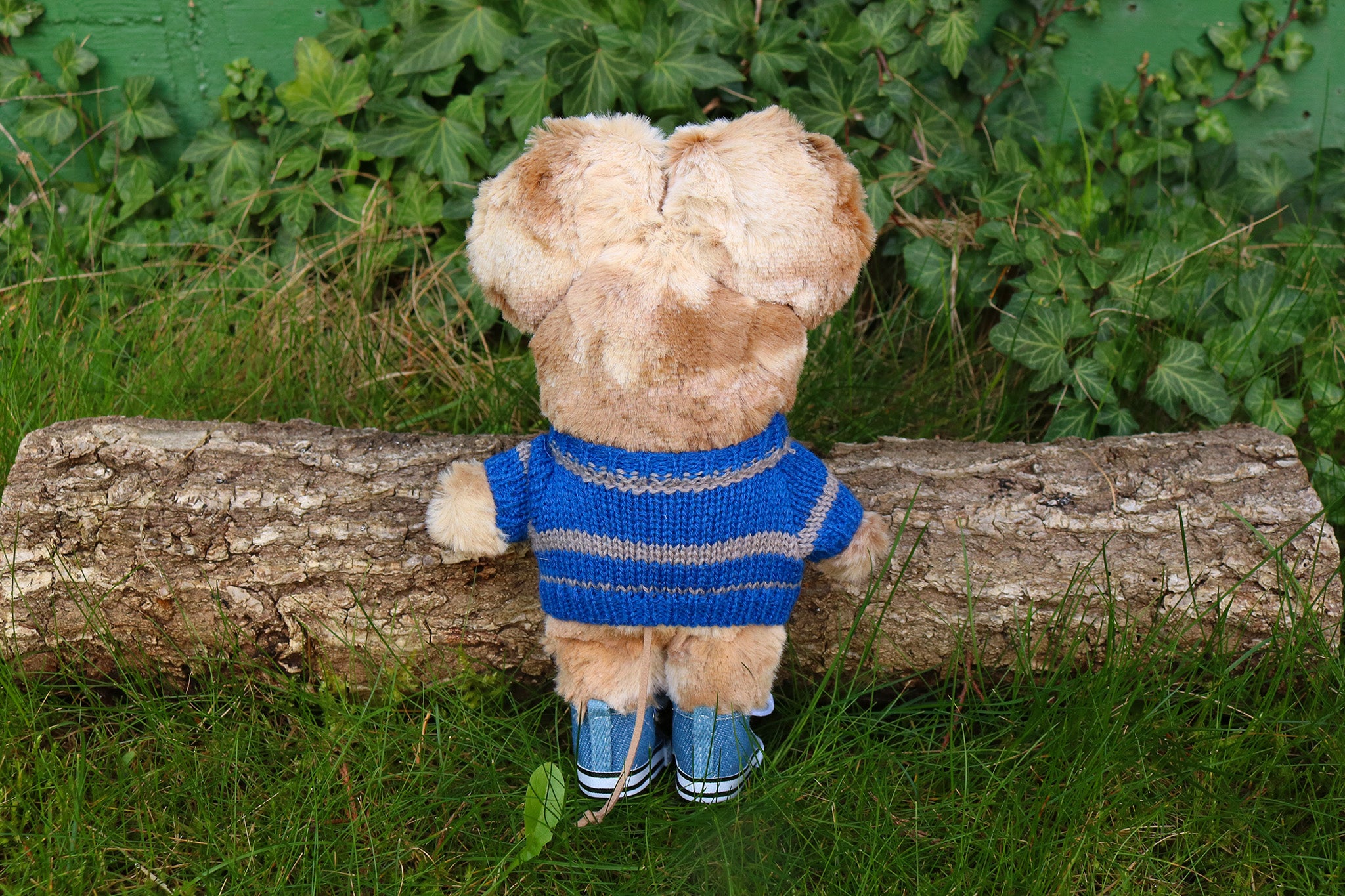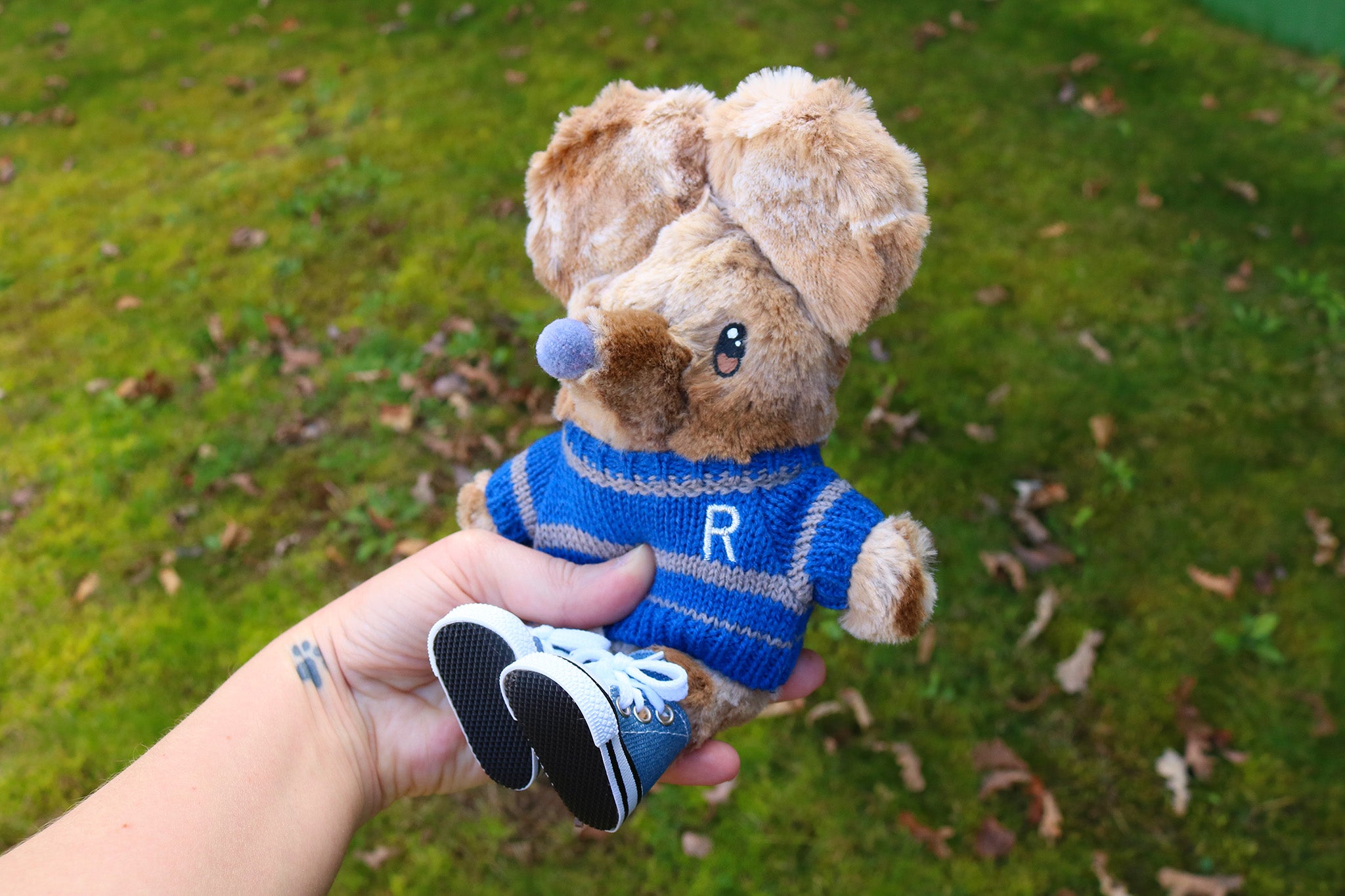 Un ratoncito de peluche con un jersey de Ravenclaw, la casa de Hogwarts de la saga ¨Harry Potter¨. El jersey y las zapatillas se le pueden poner y quitar. Le vale la ropa de muñecos de 20cm de tamaño que podéis encontrar en diversas plataformas de venta.