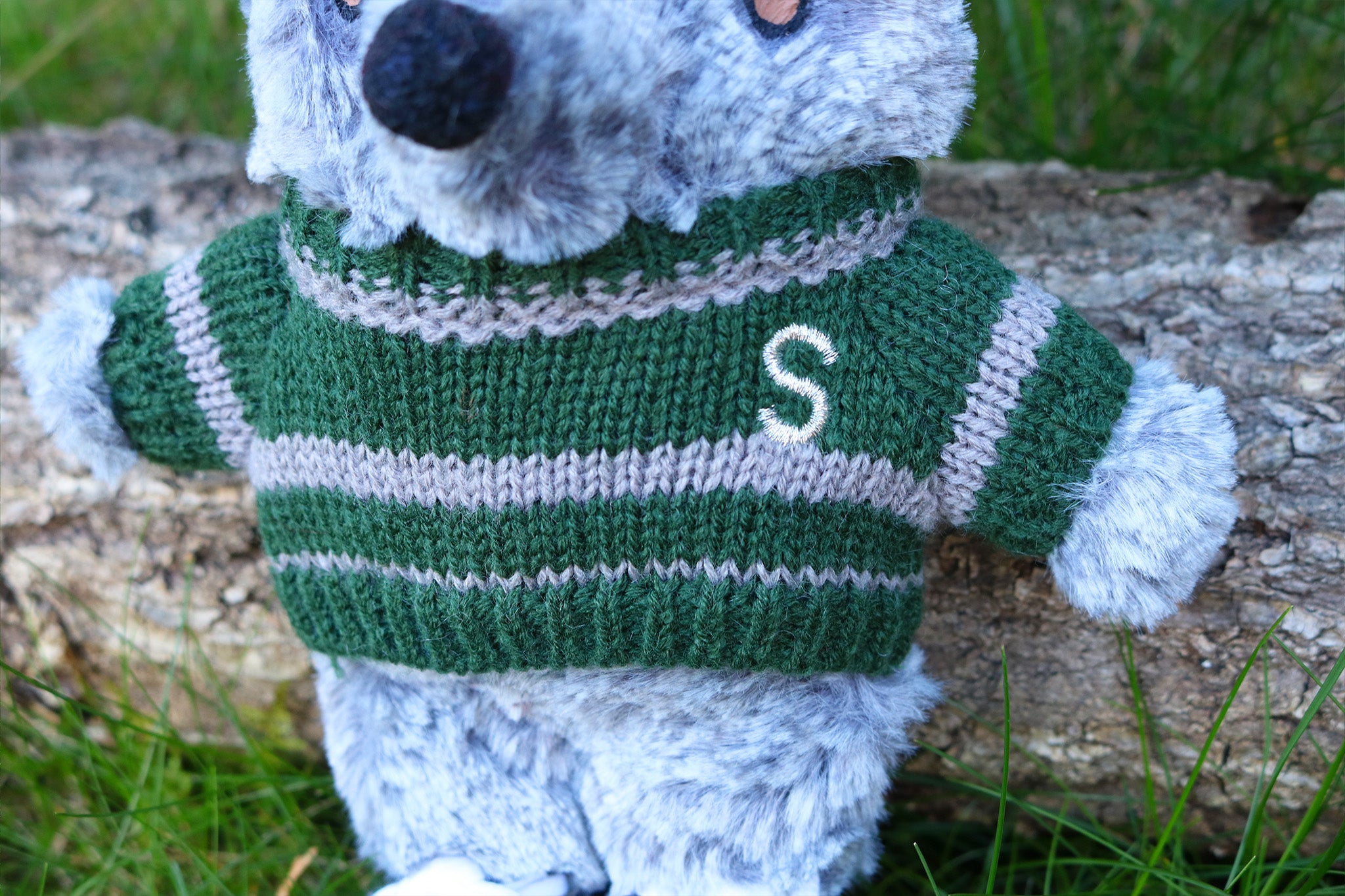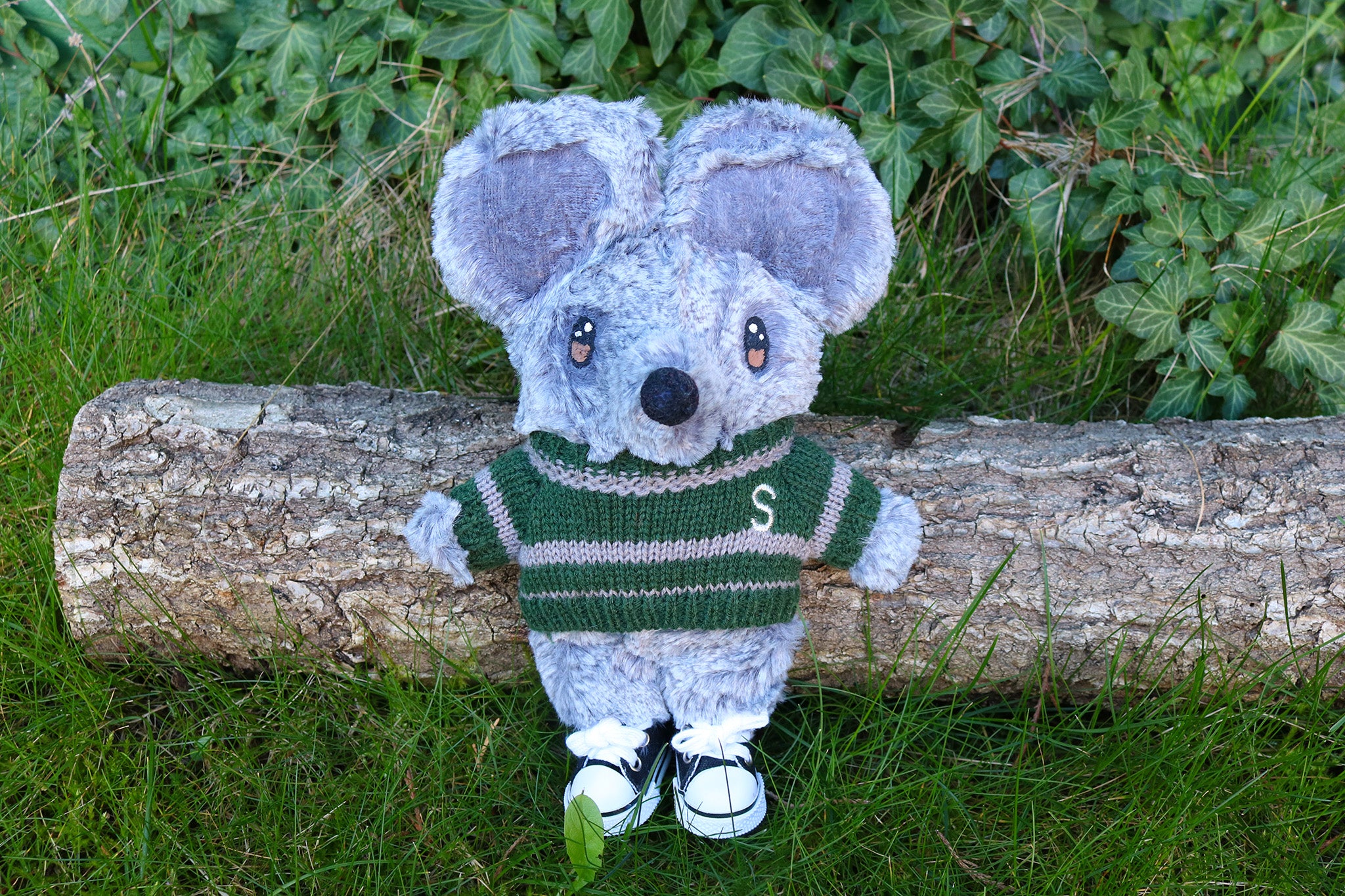 Un ratoncito de peluche con un jersey de Slytherin, la casa de Hogwarts de la saga ¨Harry Potter¨. El jersey y las zapatillas se le pueden poner y quitar. Le vale la ropa de muñecos de 20cm de tamaño que podéis encontrar en diversas plataformas de venta.